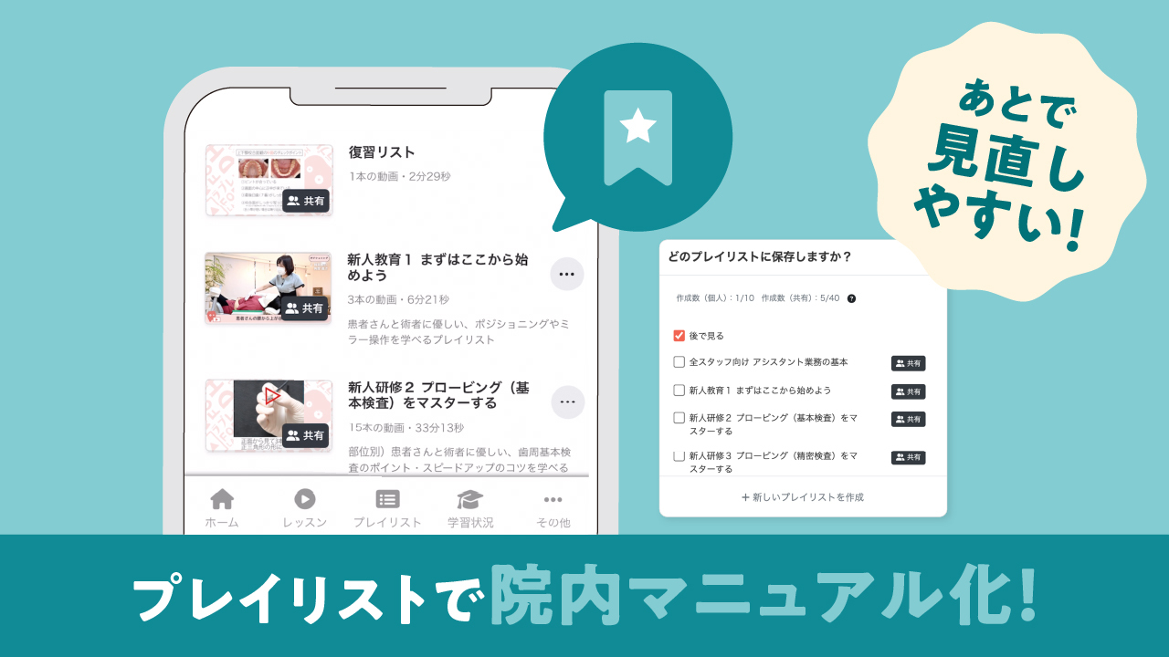 院内のスタッフ全員で共有できるプレイリストが40個作れるので、ラプレッスンの動画を自由に組み合わせた動画マニュアルとして使うことができます。